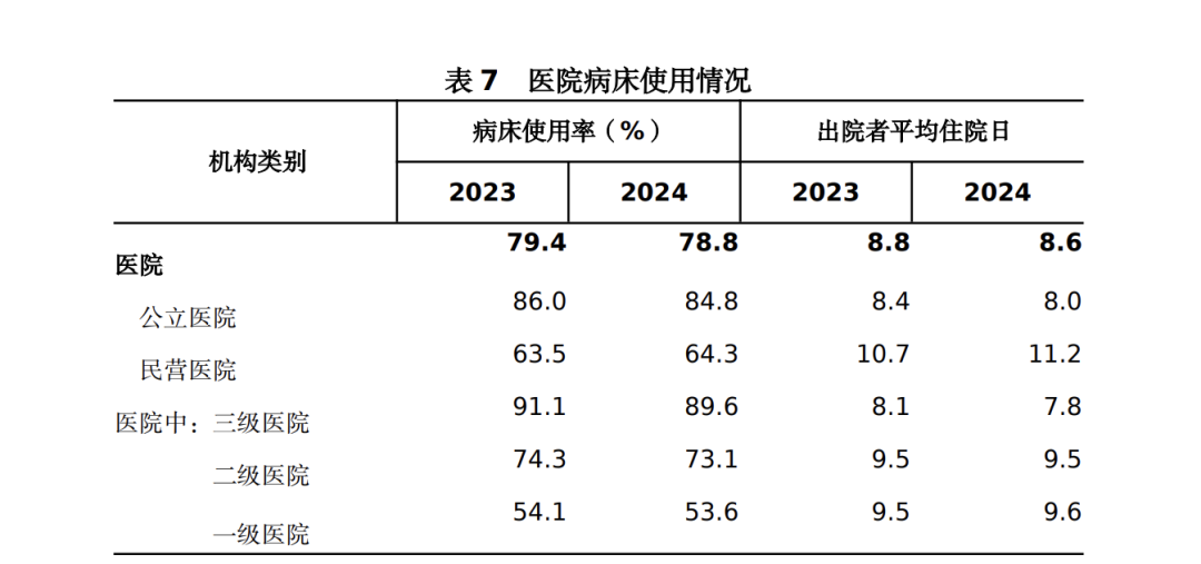 公报数据显示,2024年,全国医院病床使用率为78.8%。其中公立医院的病床使用率为84.8%,相较于上一年(86%)有所下降。分医院级别来看,当年一二三级 医院病床使用率分为53.6%、73.1%和89.6%,较上一年均出现下降。除了医疗服务供需关系外,医院病床使用率降低也或与出院者平均住院时长受政策引导出现降低有关。